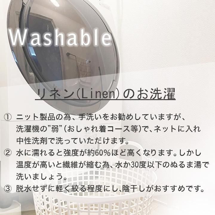 お洗濯は、ニット製品の為手洗いをお勧めしていますが、ご家庭の洗濯機の “弱”(おしゃれ着コース・デリケートコース等)で、ネットに入れ中性洗剤であればご使用いただけます。