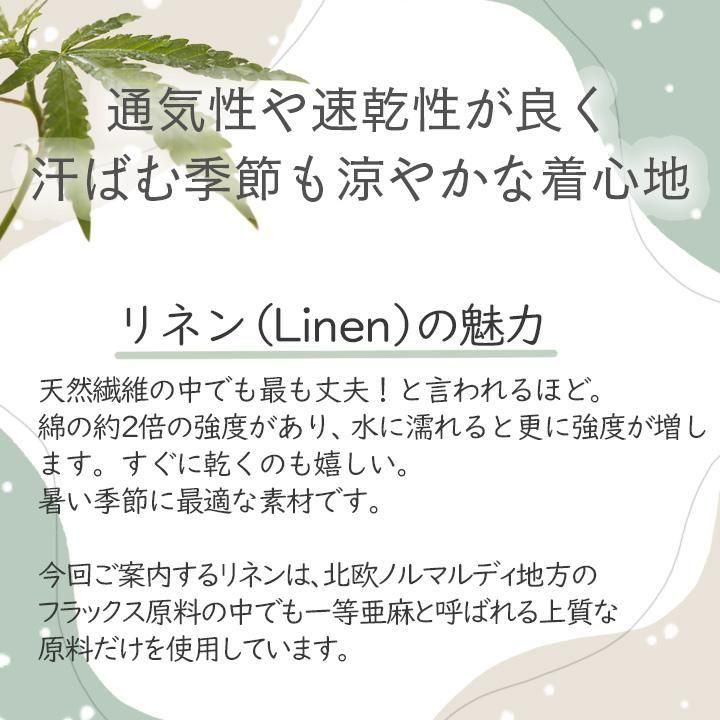リネンは綿の約4倍、シルクの約10倍の吸水性があると言われており、汗ばむ暑い季節にさらっと涼やか、軽やかに着れる最適な素材です。 また、天然繊維の中でも最も丈夫!と言われるほど。綿の約2倍の強度があり、水に濡れると更に強度が増します。