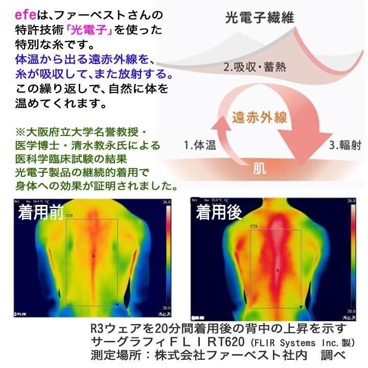 《光電子®素材》 ・光電子®は、体温域で効率よく遠赤外線をふく射する集熱保温素材です。 ・自分の体温を利用して身体をあたためるため、熱くなりすぎず自然に快適に過ごすことができます。 ・光電子®には数種類のセラミックスが繊維の中に練り込まれているので洗濯しても効果が持続します。 |