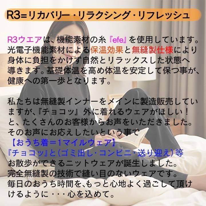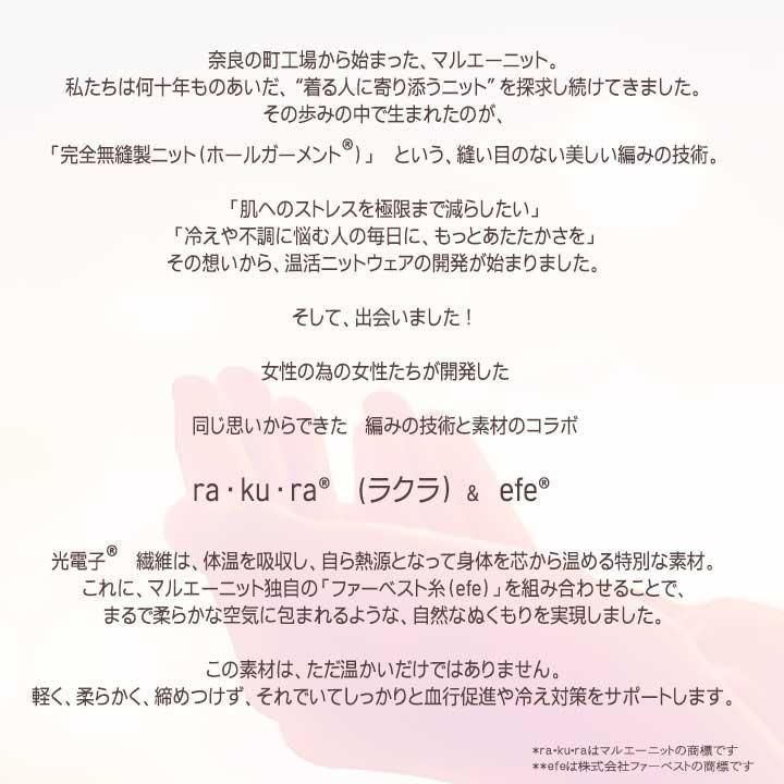 マルエーニット=ラクラの完全無縫製の技術と、素材は光電子®=efeというの自分の体温で身体をじんわり温める!! 良いところどりのお家着(パジャマ・ルームウェア・マイルウェア(コンビニやゴミ出し ちょっこっとおでかけ))として 今までのインナーより少しおしゃれに、カジュアルに誕生しました。